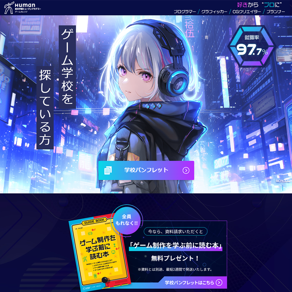 全国のゲーム関連企業から求人多数!就職・進路決定率は驚異の97.7%